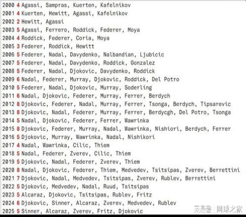 今年是2025年的最后一天,回顾这一年,有新人进入了世界前十,也有人从赛季开始到结束都矗立在前十行列。那么回顾近二十年来的世界前十,谁又是最稳定的球员呢?毫无疑问,费德勒、纳达尔、德约科维奇成为二十年来最稳定球员!