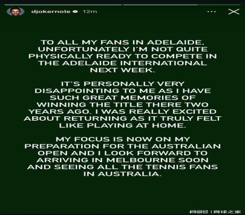 “很遗憾,我的身体状态尚未准备好参加下周的阿德莱德国际赛。 这对我个人而言非常令人失望,因为我对两年前在那里夺冠的经历仍记忆犹新。我原本对重返赛场满怀期待,那里于我而言就像主场一样。 如今我的重心已放在澳网的备战上,我期待很快抵达墨尔本,与澳大利亚所有的网球迷相见。”德约科维奇在声明中坦率地表达了身体状态未达最佳的事实。 字里行间透露出这位网坛传奇复杂的心绪,既有对无法参赛的遗憾,也有对过往荣耀的珍视,更有对澳大利亚这片土地的深厚情感。
