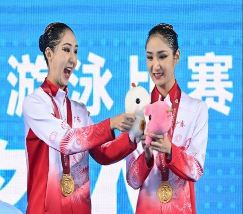 2025年11月15日,获得十五运会花样游泳女子双人项目冠军的广东队组合王柳懿/王芊懿在领奖台上与吉祥物互动。新华社发 作为奥运冠军,王柳懿/王芊懿是四战全运会才第一次拿下花游双人项目金牌,能和亲姐妹在主场登顶,也使得二人的职业生涯格外圆满。“之前大大小小的比赛都参加过,我们的职业生涯里还没有拿过全运会的这块金牌。能在家门口主场作战最后夺金,对我们来说是非常圆满的一个结果。” 王芊懿笑言。