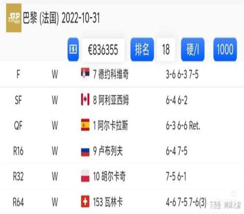 3.鲁内2022巴黎 鲁内迄今为止生涯唯一一项大赛冠军中,德约依旧充当了背景帝。丹麦人在首轮先丢一盘的情况下,双见七逆转瓦林卡。紧接着,他又两盘直落拿下了世界第十胡尔卡奇和第九卢布列夫。 八强战面对世界第一阿卡,他在拿下首盘,次盘即将迎来抢七之际,对手因伤退出,鲁内不战而胜挺进四强。半决赛面对那一年室内硬地打疯了的阿利亚西姆,鲁内终止了对方的连胜,这足以显示自身的状态。最后的决赛,尽管先丢一盘,但随后全面接管比赛。