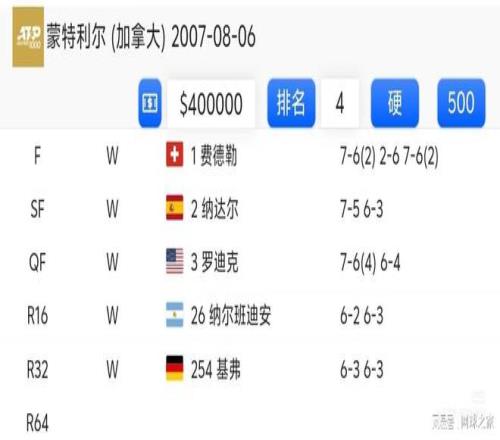 4.德约科维奇2007蒙特利尔 这是德约在当年迈阿密首夺大师赛后,又一次角逐到了大赛的最后。首轮享受轮空的他,次轮完胜德国老将基弗。第三轮拿下纳尔班迪安也是没费吹灰之力。最后三场比赛,他分别拿下世界第三罗迪克、世界第二纳达尔以及世界第一费德勒。这一成绩也是很耀眼的。
