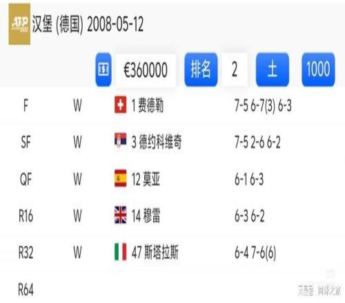 5.纳达尔2008汉堡 纳达尔在当时还未降档的汉堡赛上也是战绩不俗。进入十六强后,依次战胜穆雷、莫亚、德约和费德勒夺冠。 当然,夺冠过程中战胜德约拿到含金量十足的大师赛还不止这些,你还能想到哪些呢?(来源:网球之家 作者:罗城七爷) |