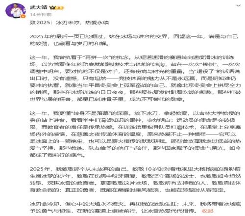 致2025:冰刃未凉,热爱永续 2025年的最后一页已经翻过,站在冰场与讲台的交界,回望这一年,满是与自己的较劲,也藏着与岁月的和解。 这一年,我曾执着于“再拼一次”的执念。从短道速滑的赛道转向速度滑冰的训练场,以为凭着多年的功底就能跨越技术与体能的鸿沟,却在一次次“摔倒”、一次次调整中明白,要对抗的不仅是对手,还有伤病与时光的重量。当“退役了”的话语说出口时,没有遗憾,只有坦然——竞技体育的魅力从不是永远赢,而是明知难仍要冲的执着,就像当年平昌冬奥会上孤军奋战的自己,就像北京冬奥会上拼尽全力的瞬间。那些在冰场训练的日日夜夜,那些腰伤复发时趴着吃饭的煎熬,那些打破世界纪录的狂喜,都早已刻进骨子里,成为不可替代的勋章。 这一年,我更懂“转身不是落幕”的深意。放下冰刀,拿起教案,以吉林大学教授的身份站上讲台,看着学生们渴望知识的眼神,突然明白:运动员的使命是突破极限,而教育者的责任是传承热爱。在训练馆里指导队员打磨技术,在课堂上分享赛场内外的感悟,在慈善之夜传递体育的温度,原来热爱不止一种模样——它可以是冰面上的一骑绝尘,也可以是薪火相传的默默耕耘。那些曾支撑我走过低谷的热爱与坚持,那些教练、队友给予的信任与陪伴,那些国家赋予的使命与荣光,如今都成了我前行的底气。 2025年,我致敬那个从未放弃的自己。致敬10岁时对着电视里大杨扬姐的身影萌生滑冰梦的少年,致敬在伤病中咬牙康复、致敬坚守赛场的战士,也致敬如今坦然转型、深耕冰雪的教育者。更要致敬这片冰场,致敬所有支持我的人,致敬竞技体育教会我的:真正的勇者,既能在巅峰时乘风破浪,也能在转型时从容笃定。 冰刃会冷却,但心中的火焰永不熄灭。再见我的运动生涯;未来,我将带着冰场赋予的勇气与韧性,在新的赛道上继续前行,让冰雪热爱代代相传。 编辑 刘佳妮 |