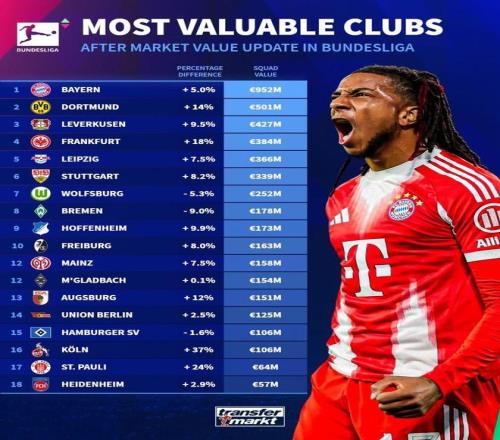 德甲俱乐部身价排名:拜仁超9.5亿高居第1,多特、药厂二三位