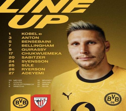 多特vs毕尔巴鄂竞技:吉拉西、阿德耶米首发,乔布出战