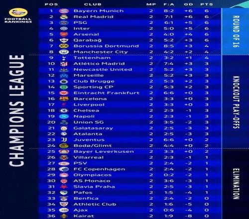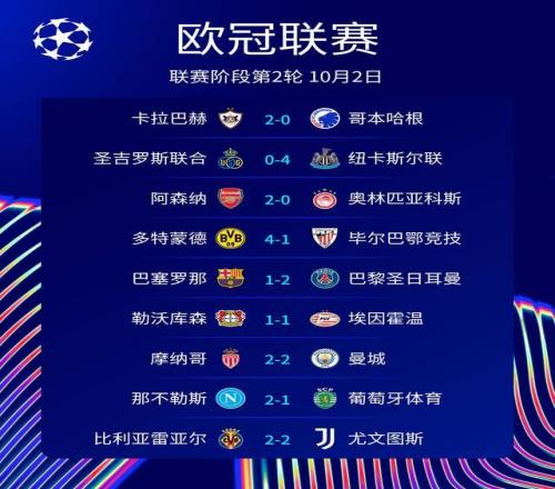 北京时间10月2日凌晨,25-26赛季欧冠联赛阶段第2轮第2天的9场比赛打响,巴塞罗那坐镇主场面对巴黎圣日耳曼堪称本轮最重磅较量,结果惨遭1-2逆转绝杀! 巴萨作为上赛季西甲冠军,今夏并未进行大手笔引援,新赛季开局以来继续保持稳定状态。巴黎贵为上赛季欧冠冠军,头号球星登贝莱刚获金球奖,球队士气正盛。 两队此战均有所轮换,巴萨派上费兰-托雷斯单箭头,身后是亚马尔、奥尔莫和拉什福德。巴黎更是半主力阵容,巴尔科拉、马尤卢和姆巴耶组成进攻三叉戟,金球先生登贝莱未进大名单。 比赛开始后,双方展开积极对抗。来到第19分钟,亚马尔抢断后巴萨压上反击,拉什福德左侧斜塞,费兰-托雷斯跟进破门,巴萨1-0取得领先! 第38分钟,巴黎发起反击,努诺-门德斯带球推进直塞,马尤卢将球攻入网中,力助巴黎1-1扳平! 这个上半场,缺少了登贝莱、K77和杜埃三人组的巴黎在客场稳扎稳打,并未太多受落后1球的局面影响。 反倒是巴萨在领先后,面对巴黎接连的攻势,有些疲于应对,从而被对手扳平! 下半场易边再战,巴黎两位锋线年轻球员颇为抢眼,19岁的马尤卢和17岁小将姆巴耶接连制造威胁。巴萨中后场防守压力不小,因而也难以为进攻端提供火力。 第90分钟,场上僵局终于被打破,阿什拉夫右侧送出精妙横传,贡萨洛-拉莫斯攻入绝杀,1-2! 全场战罢,巴萨主场1-2惨遭巴黎逆转,遇本赛季球队首败,各项赛事5连胜就此终结! 主力锋线组合缺阵的情况下,巴黎依旧展现出了不俗的实力,成功取得了本赛季欧冠2连胜! 看到其它较量,今夏从曼联来到那不勒斯的霍伊伦踢疯了,上演梅开二度。力助球队2-1击败葡萄牙体育,成功当选全场最佳球员! 曼城客场2-2遭摩纳哥绝平,哈兰德同样上演梅开二度,当选全场最佳球员。 第36分钟,德布劳内送出直塞,霍伊伦单刀破门,1-0!第79分钟,德布劳内左侧传中,霍伊伦头球得分,2-1! 不得不感叹,难道说曼联真是个鱼缸? 至此,本赛季欧冠联赛阶段第2轮的第2天9场较量战罢,结果分别为:卡拉巴赫2-0哥本哈根、圣吉罗斯联合0-4纽卡斯尔联、阿森纳2-0奥林匹亚科斯、多特蒙德4-1毕尔巴鄂竞技、巴塞罗那1-2巴黎圣日耳曼、勒沃库森1-1PSV埃因霍温、摩纳哥2-2曼城、那不勒斯2-1葡萄牙体育、比利亚雷亚尔2-2尤文图斯。 第2轮过后,25-26赛季欧冠联赛阶段积分榜更新,拜仁、皇马、巴黎、国米、阿森纳、卡拉巴赫同积6分位列前6,随后是积4分的多特、曼城和热刺! |