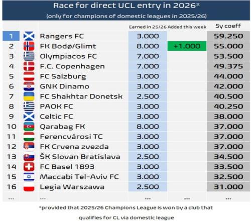雷速体育10月2日讯 在欧冠战平托特纳姆热刺后,博德闪耀的欧足联俱乐部积分来到了55分。因此成为欧足联国家系数前十之外国家中排名最高的联赛冠军。这意味着,如果博德闪耀在2025年赢得挪威超级联赛冠军,他们将直接晋级2026年欧冠联赛,无需参加资格赛。 但挪威超级联赛冠军直通欧冠的名额仅适用于博德闪耀。即使维京或莫尔德赢得了联赛冠军,他们仍然需要参加资格赛,因为截至目前为止,他们的有关系数要低得多。目前博德闪耀在少赛一轮的情况下,落后榜首的维京1分。 |