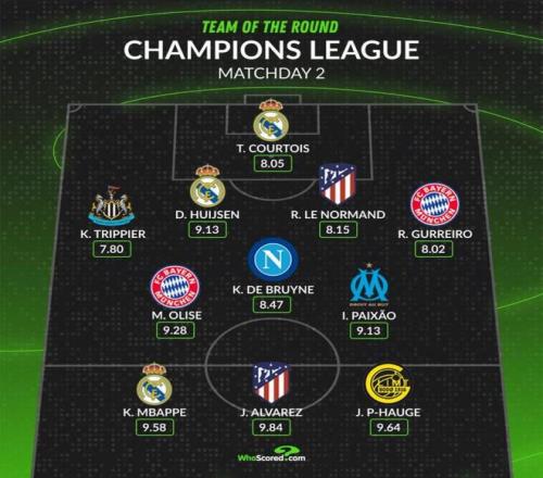 姆巴佩领衔!欧冠第二轮最佳阵容,凯恩落选,德布劳内在列