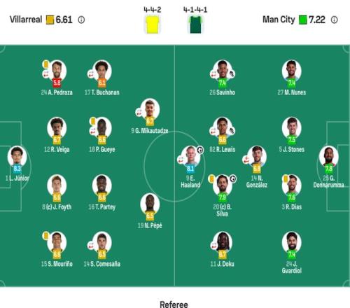 北京时间10月22日凌晨,欧冠第三轮继续进行,比利亚雷亚尔主场对阵曼城。第17分钟,刘易斯助攻哈兰德破门。第40分钟,曼城如法炮制,萨维尼奥助攻B席破门。最终,曼城客场2-0战胜黄色潜水艇比利亚雷亚尔,迎来各项赛事的3连胜,欧冠前3轮2胜1平。 【比赛焦点】 第17分钟,曼城打出精彩配合,刘易斯下底后第一时间传中,哈兰德抢射破门。 哈兰德本赛季的状态超级出色,这是他最近两场比赛打进的第3球,本赛季12场赛事场场进球,一共打进22球。 第40分钟,萨维尼奥的传中恰到好处,B席插上无人盯防,头槌破门。 【精彩瞬间】 第1分钟,开场之后,曼城打出连续配合,萨维尼奥传球,多库的推射被儒尼奥尔奋力扑出。 第28分钟,盖耶禁区外起脚怒射,皮球力量大速度快,擦着门柱稍稍偏出。 第35分钟,面对直上直下的高空球,盖耶干扰了多纳鲁马,多纳鲁马搂着对方进行交流,引起了对方的极度不满。 第70分钟,经过换人调整的比利亚雷亚尔连续威胁曼城的球门,多纳鲁马做出关键扑救,力保球门不失。 第77分钟,比利亚雷亚尔的传中被头球解围,佩佩后点无人盯防,一记凌空抽射,放了高射炮。 第80分钟,接到队友的长传,哈兰德的射门干脆利落,儒尼奥尔候个正着,将球没收。 第83分钟,哈兰德禁区前连续横向摆脱后打向反角,儒尼奥尔奋力将球扑出。 第89分钟,比利亚雷亚尔球员的头球击中立柱,多纳鲁马没有什么反应。 【球员评分】 【出场阵容】 比利亚雷亚尔首发:1-路易斯·儒尼奥尔、15-穆里尼奥、8-福伊特、12-维加、24-佩德拉萨(46’23-卡尔多纳)、17-布坎南(66’20-莫莱罗)、14-康萨尼亚(72’22-阿约泽·佩雷斯)、16-托马斯、18-帕佩·盖耶(81’10-帕雷霍)、19-佩佩、9-米卡乌塔泽(66’21-奥卢瓦塞伊)。 比利亚雷亚尔替补:13-康德、25-特纳斯、3-阿尔蒂米拉、4-马林、6-所罗门、11-阿克霍马奇、7-赫拉德·莫雷诺。 曼城首发:25-多纳鲁马、27-努内斯、5-斯通斯、3-鲁本-迪亚斯、24-格瓦迪奥尔、14-尼科-冈萨雷斯(46’8-科瓦契奇)、82-刘易斯(72’4-赖因德斯)、20-B席、26-萨维尼奥(86’10-谢尔基)、11-多库(72’52-鲍勃)、9-哈兰德(86’7-马尔穆什)。 曼城替补:1-特拉福德、13-贝蒂内利、6-阿克、33-奥赖利、21-努里、47-福登。 |