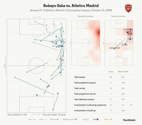 萨卡从十月份国际比赛日归来后,就一直处于某种状态之中。不是坏情绪,而是一种毫不留情的状态。 这位边锋在上周末对阵富勒姆的比赛中,将对方后卫瑞安-塞塞尼翁彻底 “拆解”。在克拉文农场球场,他的多项数据冠绝全场:赢得14次对抗、13次在对方禁区内触球、10次夺回球权、创造6次机会、完成6次过人、赢得5次犯规。 他对阵马竞时延续了类似的表现,开场几分钟内就让左后卫汉茨科束手无策。他没有选择内切用擅长的左脚,而是自信地走外线,并成功向禁区送出一记有力的低平传中。基调在早期就已定下。