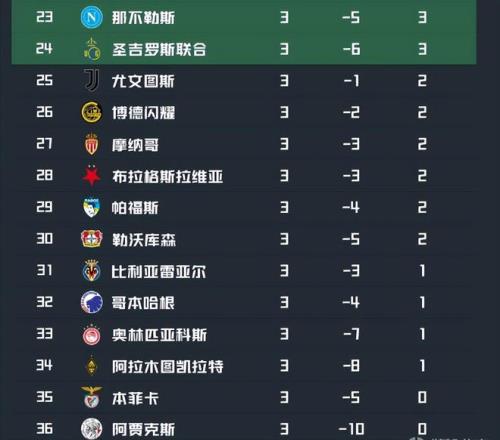 热刺是唯一取得1胜2平积5分的球队,独自排在第15,埃因霍温和亚特兰大则是1胜1平1负积4分位列第16和第17。马赛、马竞、布鲁日、毕尔巴鄂竞技、法兰克福、那不勒斯以及圣吉罗斯联合都是1胜2负积3分,依次排在第18至第24位,尤文图斯、博德闪耀、摩纳哥、布拉格斯拉维亚、帕福斯和勒沃库森则均为2平1负积2分,位列第25至第30。只取得了1平2负的比利亚雷亚尔、哥本哈根、奥林匹亚科斯和阿拉木图凯拉特以1分排在第31至第34,三战皆墨一分未得的本菲卡和阿贾克斯则只能垫底。 |