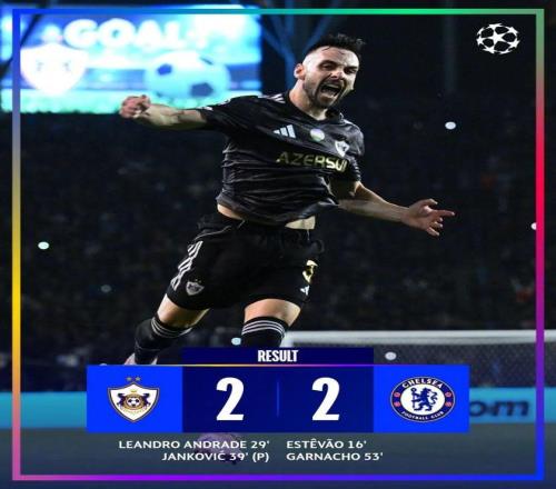 马雷斯卡大轮换阵容在客场翻车,上半场拉维亚开场不久就伤退,埃斯特旺16分钟进球领先,29分钟哈托失误,安德拉德扳平。39分钟哈托禁区内手球送点,扬科维奇点射,切尔西半场1-2落后。 下半场7分钟加纳乔传球被挡后左脚推射扳平,最终,首发身价仅1232万欧的卡拉巴赫2-2逼平4.2亿欧的切尔西。这是卡拉巴赫欧战7次面对英超球队拿到的第一分。