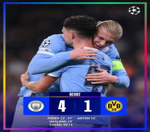 上半场福登远射破门,哈兰德爆射扩大领先。下半场福登梅开二度,安东扳回一球,谢尔基补时锁定胜局,莱因德斯贡献两次助攻。 最终曼城4-1大胜多特,曼城4轮3胜1平不败,积10分暂居第4,多特7分第14。 |