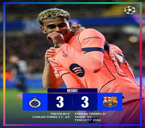 巴萨三度落后三度追平,上半场特雷索尔迪率先进球,费兰-托雷斯迅速扳平,博尔赫斯破门主队半场2-1领先。下半场费尔明助攻亚马尔扳平,博尔赫斯梅开二度,亚马尔造佐利斯乌龙,两队3-3握手言和。 亚马尔的欧冠生涯已经贡献7球6助攻,成为继姆巴佩之后,第二位在19岁前欧冠直接参与13球的球员。 Squawka统计,亚马尔本赛季各项赛事10次登场5球5助攻,总计参与10球,场均参与1球。 卡拉巴赫2-2切尔西