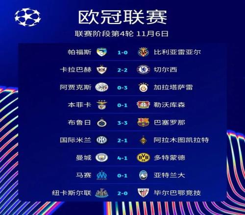 欧冠联赛阶段赛程过半,巴萨和切尔西都积7分,分别排名第11和第12,下一轮两队将直接交手。 帕福斯1-0比利亚雷亚尔