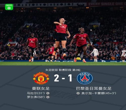 北京时间11月13日女足欧冠 联赛阶段 第3轮,曼联女足对阵巴黎圣日耳曼女足。曼联女足马拉尔破门,罗尔弗破门。巴黎圣日耳曼女足奥尔加-卡蒙娜破门。最终比分曼联女足 2-1 巴黎圣日耳曼女足。曼联女足取得女足欧冠的三连胜,同时送给巴黎女足3连败。 精彩瞬间 第31分钟,曼联女足球员里维埃助攻马拉尔打入一球。 上半场补时第3分钟,巴黎圣日耳曼女足球员格勒嫩助攻奥尔加-卡蒙娜打入一球。 第58分钟,曼联女足球员安娜-松德贝里助攻罗尔弗打入一球。