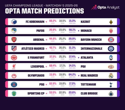 欧冠联赛阶段第5轮 周四凌晨对阵 01:45 哥本哈根vs阿拉木图凯拉特 01:45 帕福斯vs摩纳哥 04:00 阿森纳vs拜仁慕尼黑 04:00 马德里竞技vs国际米兰 04:00 巴黎圣日耳曼vs热刺 04:00 利物浦vs埃因霍温 04:00 奥林匹亚科斯vs皇家马德里 04:00 里斯本竞技vs布鲁日 04:00 法兰克福vs亚特兰大 |