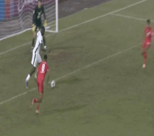 随后,主裁判做出争议判罚,认定江文豪禁区内手球,判罚给河内公安点球。然而,若奥-阿图尔主罚的点球被张健智飞身没收,国安逃过一劫。