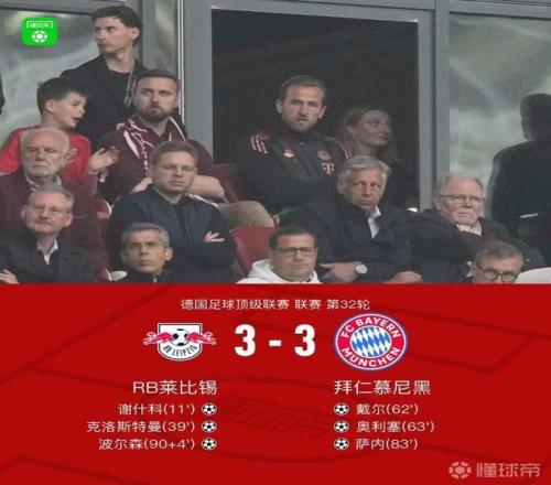 赛前,拜仁距离夺得赛季德甲冠军近在咫尺,只需一胜。这也会是凯恩的首座五大联赛冠军,但大英帝星本场只能在看台观战。 德甲联赛第32轮,RB莱比锡主场对阵拜仁慕尼黑。上半场,谢什科建功,克洛斯特曼破门帮助莱比锡建立两球领先优势;下半场,比赛信号一度中断,戴尔头球破门扳回一城,奥利塞迅速扳平比分,萨内抽射破门反超比分,但比赛最后时刻波尔森上演绝平。最终,拜仁在客场苦战中,3-3战平莱比锡,凯恩的首冠因而继续推迟。