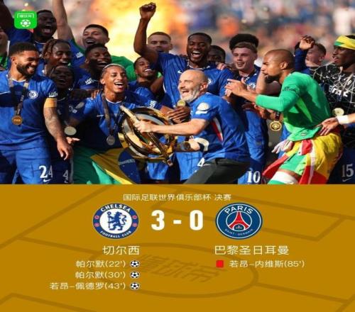 欧协联冠军切尔西与新科欧冠冠军巴黎在美国的盛夏相遇。巴黎志在包揽赛季的每一项锦标。而切尔西则希望拿出全力迎战强敌,为整个赛季画上的句号。 世俱杯决赛在美国新泽西州大都会人寿体育场展开角逐,切尔西对阵巴黎圣日耳曼,本场主裁判为法加尼(澳大利亚)。上半场,帕尔默天神下凡推射梅开二度后又助攻若昂-佩德罗挑射破门。下半场,若昂-内维斯拽库库雷利亚头发被直红罚下。最终,切尔西3-0完胜巴黎,夺改制后世俱杯首冠!