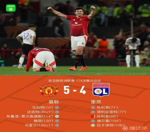 赛前,状态不佳的曼联在联赛中深陷低谷。首回合曼联在客场与里昂战成2-2平。为欧冠席位而战,曼联此役必须取胜。 欧联1/4决赛次回合,曼联与里昂展开对决。上半场,乌加特和达洛特先后破门为曼联取得两球领先。下半场,托利索和塔利亚菲科6分钟内扳平比分,托利索随后吃到第二张黄牌被罚下。90分钟战罢,两队战平进入加时赛。加时赛,谢尔基破门,拉卡泽特点射得分。不过随后比赛进入最高潮,先是B费点球扳回一城。随后,梅努完成绝平。卡塞米罗传中,马奎尔头槌绝杀。全场比赛结束,曼联加时赛连进三球5-4逆转击败里昂,并且以两回合7-6的总比分晋级欧联4强。