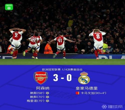 皇马通过两回合苦战马竞跻身欧冠八强。阿森纳早早大比分领先埃因霍温成功晋级。1/4决赛中,两队狭路相逢。 北京时间4月9日,阿森纳坐镇酋长球场迎战皇家马德里。上半场帕尔特伊远射被扑,姆巴佩单刀打高,随后姆巴佩打门被拉亚扑出,赖斯和马丁内利打门被库尔图瓦神勇扑出,下半场赖斯神级任意球破门,库尔图瓦屡次扑救救险,赖斯天外飞仙任意球梅开二度,梅里诺兜射死角锁定胜局,卡马文加两黄变一红被罚下。最终比分阿森纳3-0皇马。