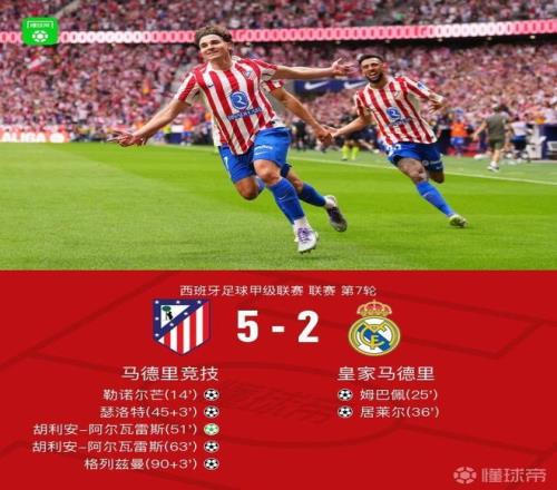 西甲联赛第7轮,马德里竞技主场对阵皇家马德里。马竞本赛季开局不佳,六轮仅取两胜,功勋主帅西蒙尼竟然也遭遇了前所未有的压力,甚至包括下课危机。 马德里竞技勒诺尔芒率先头球破门,居莱尔助攻姆巴佩扳平,随后居莱尔抽射反超比分。上半场补时阶段瑟洛特绝平。下半场,胡利安-阿尔瓦雷斯点射+任意球破门完成梅开二度,格列兹曼比赛最后时刻破门。最终比分马竞 5-2 皇马。皇马吞下许久未见的五粒丢球。马竞和西蒙尼救赎了这个赛季,也救赎了自己。而西蒙尼的帅位由此彻底稳固。