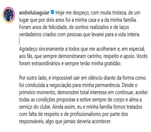 “今天,我怀着无比沉重的心情,向这个曾是我和家人两年家园的地方告别。”路易斯写道,“这是充满幸福的两年,是梦想成真的两年,是与许多人结下了真挚情谊的两年,这些情谊我将永远珍藏于心。我衷心感谢所有接纳我的人,特别是球迷们,你们始终给予我关爱、尊重与支持。你们如此非凡,我将永远心怀感激。”
