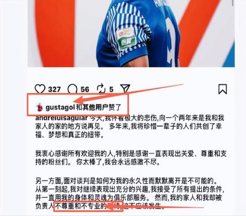 “……我一直用我的身体和灵魂为俱乐部服务,然而我的家人和我被负责人不尊敬、不专业的对待……” 这句话节选于安德烈路易斯社交平台上,控诉上海申花将自己无情扫地出门后,一段痛心控诉。