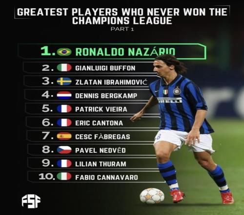 最近Fsf发布了“从未赢得欧冠冠军的最伟大球员”榜单第一部分,罗纳尔多、布冯、伊布、博格坎普、维埃拉这些名字都在列。名单里最刺眼的反差其实只集中在罗纳尔多身上:很多足球历史排名里,他往往被默认放进前十,甚至被放到更靠前的位置,可一翻欧冠冠军这一栏却是0,这种落差才会让人觉得特别别扭、特别尴尬——你越把他当成历史顶层的前锋,这个“0”就越显眼 具体排名罗纳尔多 | Ronaldo NAZÁRIO 国籍:巴西 位置:前锋 效力俱乐部:埃因霍温、巴塞罗那、国际米兰、皇家马德里、AC米兰