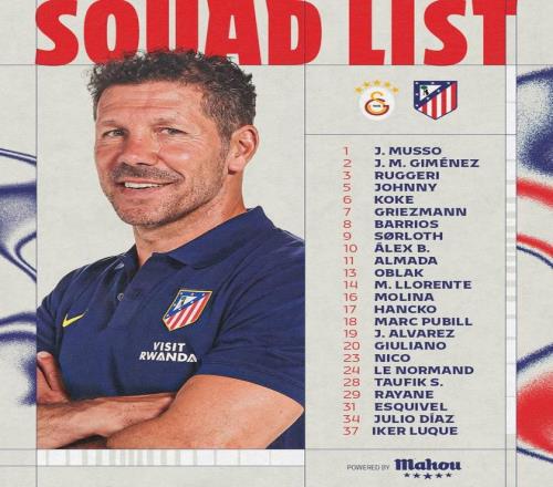 守门员:1-穆索、13-奥布拉克、31-萨尔维-埃斯基韦尔 后卫:2-希门尼斯、3-鲁杰里、14-马科斯-略伦特、16-莫利纳、17-汉茨科、18-马克-普维尔、24-勒诺尔芒、34-胡利奥-迪亚斯 中场:5-卡多佐、6-科克、8-巴勃罗-巴里奥斯、28-陶菲克-赛义杜、29-贝莱德 前锋:7-格列兹曼、9-瑟洛特、10-巴埃纳、11-阿尔马达、19-阿尔瓦雷斯、20-朱利亚诺-西蒙尼、23-尼古拉斯-冈萨雷斯、37-伊克尔-卢克 |