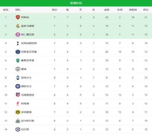 随着皇马61+阿森纳31!欧冠最新积分榜:曼城爆冷,211名差3分