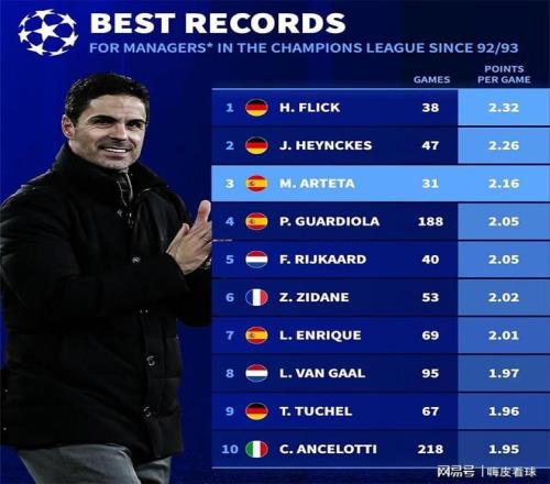 根据《德国转会市场》的统计,执教欧冠场次超过25场的主帅当中,阿尔特塔31场得到67分,场均得分2.16分,排在第三名,比曼城主帅瓜迪奥拉还要高一点。对于一名执教经历不长的主教练来说,真的很不容易。 排在前两位的都是德国人,包括巴塞罗那现任主帅弗里克,还有带领皇家马德里和拜仁慕尼黑夺冠的老帅海因克斯。值得一提的是,海因克斯虽然带队参加欧冠的场次并不多,但是却能帮助两支不同球队,时隔15年两次夺冠,很不简单。