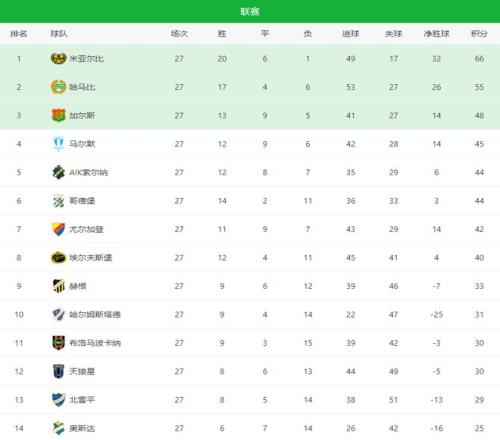 为何足球被公认为是世界第一运动呢?瑞典的一家小球会再一次向世界诠释,北京时间10月21日,瑞典超级联赛第27轮,领头羊米亚尔比2-0击败哥德堡,提前三轮加冕联赛冠军,不仅是队史首次斩获联赛冠军,更是瑞典与世界足坛的一大奇迹,这就是足球的魅力。 在比赛前,米亚尔比积63分,领先排名第二的哈马比8分,联赛还剩下4轮,只要本轮全取3分的话,那么将提前3轮夺冠,最终在主教练托尔斯滕松全取3分,如愿夺冠,并创造了瑞典足球百年历史上最不可思议的一幕,这妥妥的就是莱斯特城奇迹再现的存在啊。