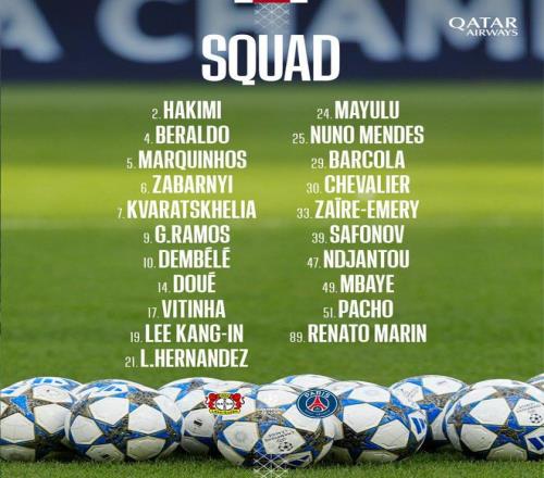 门将:30-舍瓦利耶、39-萨福诺夫、89-雷纳托-马林 后卫:2-阿什拉夫、4-贝拉尔多、5-马尔基尼奥斯、6-扎巴尔尼、21-卢卡斯-埃尔南德斯、25-努诺-门德斯、51-威廉-帕乔 中场:17-维蒂尼亚、19-李刚仁、24-马尤卢、33-扎伊尔-埃梅里 前锋:7-克瓦拉茨赫利亚、9-贡萨洛-拉莫斯、10-登贝莱、14-杜埃、29-巴尔科拉、47-康坦-恩贾恩图、49-姆巴耶 |