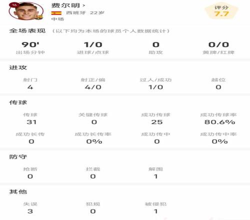 雷速体育10月27日讯 西班牙国家德比,巴萨1-2不敌皇马,此役费尔明一度为巴萨扳平比分,但最终未能帮助球队获得分数。 统计显示,费尔明本场比赛踢了90分钟,4次射门均射正,打入1球。 他1次过人,未能成功。 比赛中费尔明31次传球,25次到位,传球成功率80.6%。 此外,费尔明还贡献了1次解围。 在场上,他有3次失误,1次被侵犯。 |