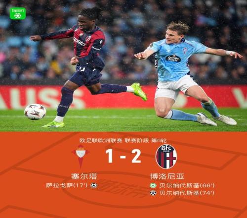 北京时间12月12日,欧足联欧洲联赛联赛阶段第六轮展开较量,塞尔塔迎战博洛尼亚。上半场,斯韦德贝里送出助攻,萨拉戈萨破门得分,为球队取得领先。下半场,贝尔纳代斯基主罚点球命中,帮助博洛尼亚扳平比分。比赛后段,坎比亚吉助攻贝尔纳代斯基再入一球,完成个人本场比赛的第二粒进球。最终,博洛尼亚客场2-1逆转塞尔塔。 关键事件 第17分钟,斯韦德贝里倒三角传球,萨拉戈萨推射破门,塞尔塔1-0