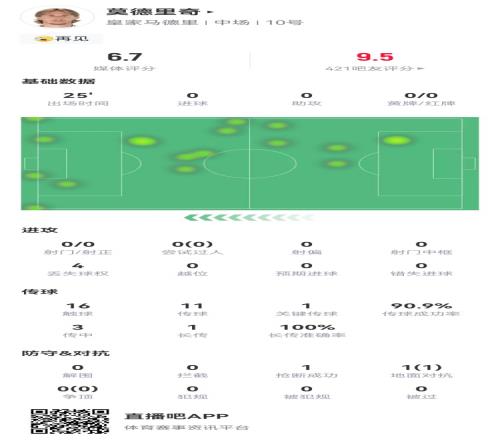 莫德里奇告别战数据:1关键传球+1抢断1成功对抗获评6.7分