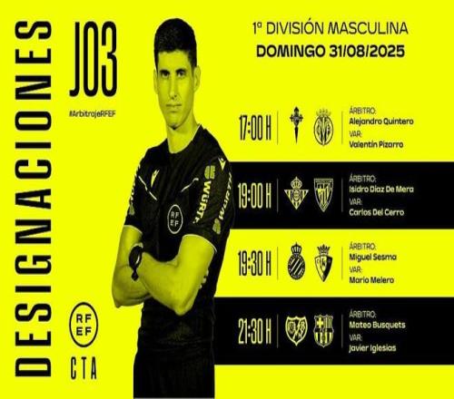西班牙足协官方公布了周日西甲裁判安排,马特奥-布斯克茨将执法巴列卡诺vs巴萨。