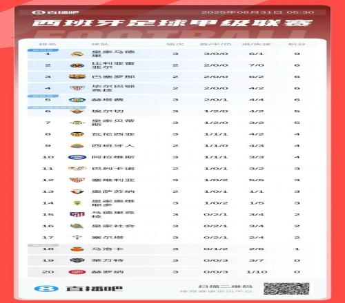 西甲积分榜:皇马三连胜暂登顶,马竞三轮不胜暂排第15