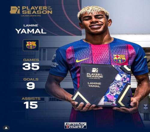 直播吧9月12日讯 《转会市场》官方宣布,18岁的巴萨边锋亚马尔当选德转评选的24-25赛季西甲MVP。 18岁的亚马尔司职右边锋,德转身价2亿欧元,同巴萨合同2031年到期。 他上赛季在西甲联赛共计出战35场,贡献9球15助攻,是巴萨赢得西甲冠军的关键先生之一。 |