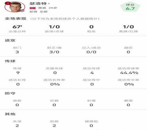 瑟洛特数据:上场67分钟3次射门打入1球,9次传球