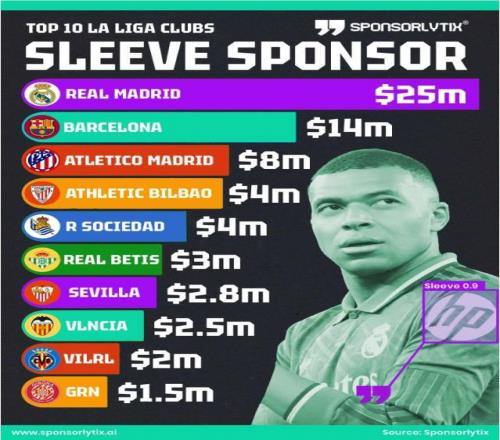 根据Sponsorlytix的一项研究,西甲当中有17家俱乐部通过球衣袖标赞助获得了收入,而合同金额最高的10支西甲球队总金额达到6680万美元。