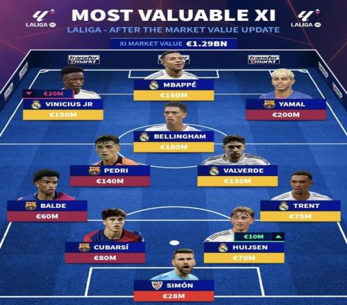 西甲身价最贵阵容发布!门将只有2800万欧只相当于亚马尔的17