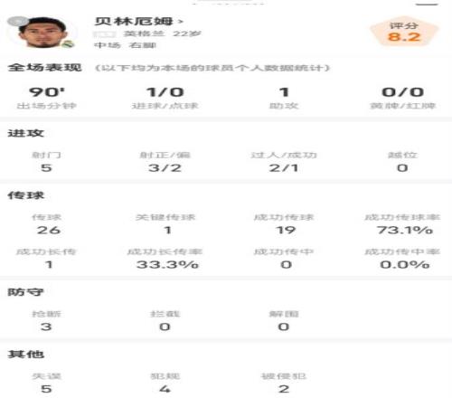 贝林国家德比数据:传射建功,5脚射门3次射正,评分8.2