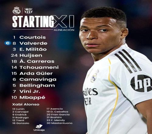 前锋:维尼修斯、姆巴佩、贝林厄姆 中场:居莱尔、楚阿梅尼、卡马文加 后卫:阿尔瓦罗-卡雷拉斯、赫伊森、米利唐、巴尔韦德 门将:库尔图瓦 |
