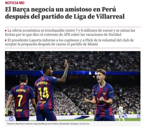 这是来自秘鲁的邀约,组织者希望巴萨能在12月份来秘鲁踢商业赛,开价700万-800万欧元。巴萨收到邀请,非常愿意前往秘鲁。用该报的话来说,这是“无法拒绝的丰厚收入”。 巴萨主席拉波尔塔,与4大队长特尔施特根、阿劳霍、德容、拉菲尼亚,以及主帅弗里克、体育总监德科,在甘伯体育城商讨这件事。拉波尔塔告诉众人,他将接受邀请,这对俱乐部的财政有着促进作用。