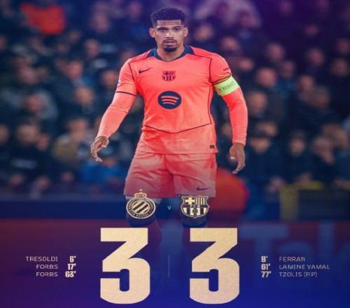 塞尔塔主帅本轮赛事可能仍会延续以攻代守的策略,利用主场球迷氛围发起高位逼抢,针对巴萨边路防守薄弱的隐患,通过杜兰・巴勃罗的速度冲击防线,同时借鉴上赛季伊格莱西亚斯的单刀破门战术,抓住巴萨后场出球失误的机会。 巴萨可能采用4-2-3-1阵型强化中场控制,德容将承担更多推进与调度职责,亚马尔将在右路自由换位撕扯防线,定位球或将成为重要得分手段,数据显示本赛季欧冠已通过定位球打入8球。但缺少莱万的高点支撑后,巴萨终结效率可能下降,需依赖费兰・托雷斯的禁区嗅觉与亚马尔的突破传中。 对巴萨而言,若能客场取胜,将缩小与皇马的积分差距至2分,重燃争冠希望;若失利,积分差距可能被进一步拉开,陷入争冠被动。对塞尔塔来说,赢球可以巩固中游位置,甚至可能冲击欧战资格区。 回看巴萨欧冠3比3布鲁日的比赛,两队开场就进入快节奏对抗,主场作战的布鲁日率先发难。第6分钟,布鲁日中场策动流畅进攻,萨贝送出精准直传,博尔赫斯高速推进至禁区后横传门前,特雷索尔迪及时包抄推射破门,为球队取得1-0的梦幻开局。