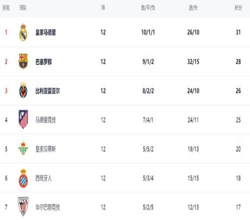 在积分榜上,皇马战绩是10胜1平1负,拿到31分,依然占据榜首位置。巴萨总积分是28分,缩小了与皇马的差距,排名第2。第3的是比利亚雷亚尔,拿到26分。马竞以25分排名第4。皇家贝蒂斯这轮只拿到平局,总积分20分,排名第5。西班牙人以18分排名第6。 |