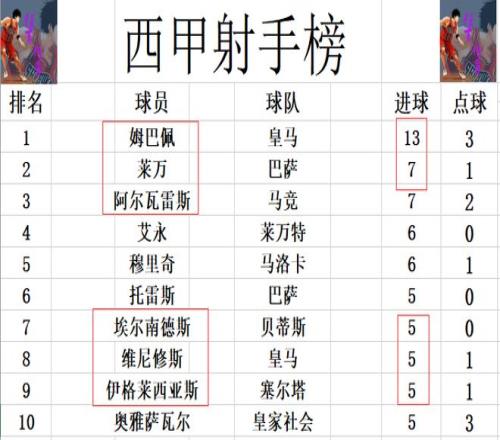 射手榜方面,姆巴佩13球依然是高居榜首,莱万今天上演帽子戏法后追了上来,追平阿尔瓦雷斯,两人7球并列第2,都是少姆巴佩6球。艾永,穆里奇6球并列第4,埃尔南德斯和伊格莱西亚斯今天都打入一球,追上托雷斯,维尼修斯,将前十门槛提高到5球。 |